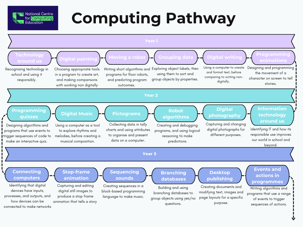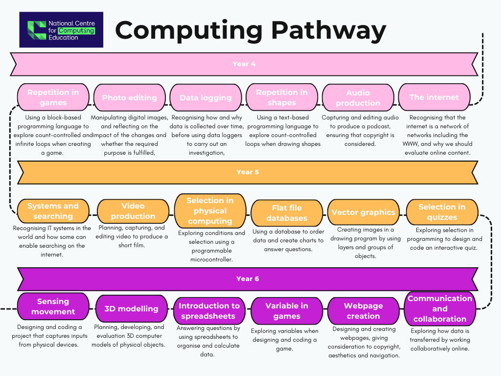 Across Key Stage 1 and Key Stage 2, we use the National Centre for Computing’s ‘Teach Computing’ programme to deliver Computing lessons. Our pupils are taught Computing in a way that ensures progression of skills in digital literacy, computer science, information technology and online safety. We equip pupils with the relevant skills and knowledge that is required to understand these core areas and to offer a broad and balanced approach to providing quality first teaching of this subject.