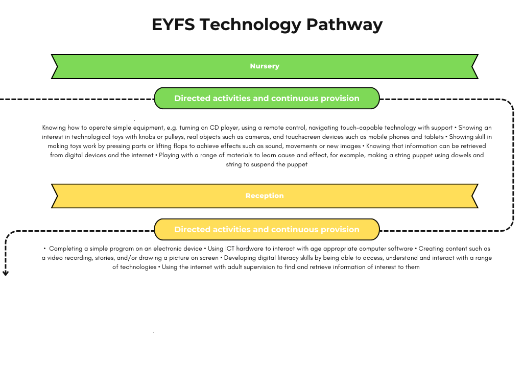In EYFS, the pupils explore different technologies through play-based activities that focus on building listening skills, curiosity, creativity and problem solving. We want the children to develop a familiarity with equipment and vocabulary that they will encounter in Key Stage 1.