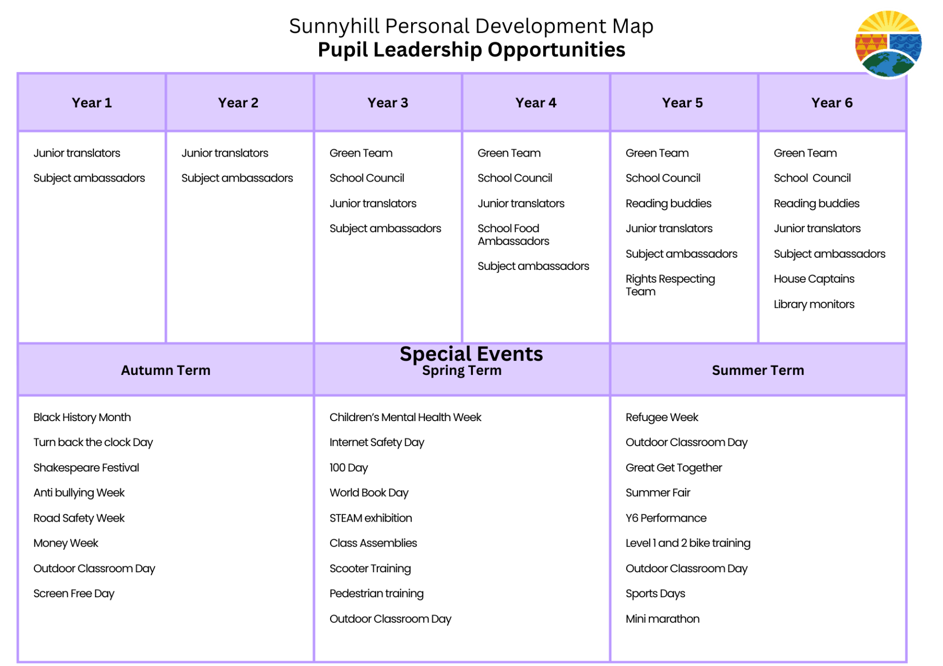 Personal development is at the heart of our curriculum and we want pupils to leave Sunnyhill Primary School ready to take on the next chapter in their lives. As part of their personal development journey we want all children to experience: